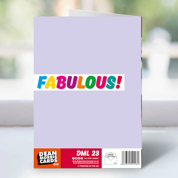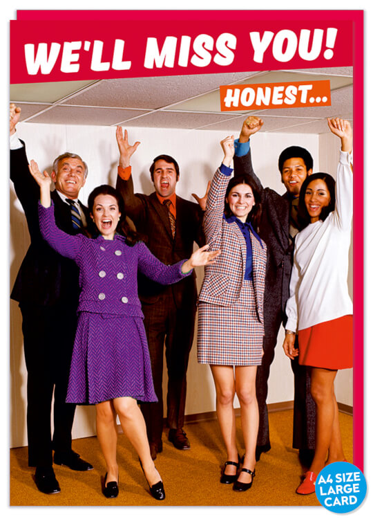 Nice big card suitable for a group leaving card. A 1960s picture of a group of office workers raising their hands in excitement. Angled white text on a red background above them reads We'll miss you Honest...