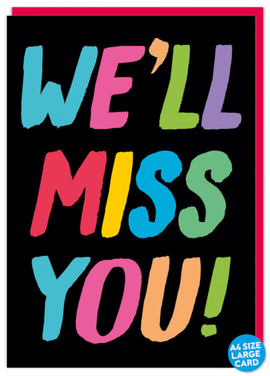 Nice big card suitable for a group leaving card. A jet black card with the words ‘We’ll miss you!’ in capitalised, alternating pastel rainbow font.