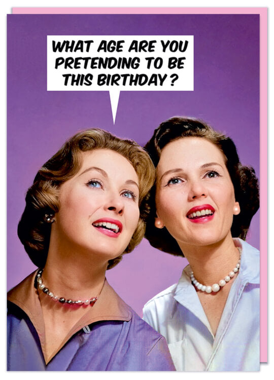 A birthday card with a 1950s picture of two middle aged women close together looking into the distance. One is saying What age are you pretending to be this Birthday?