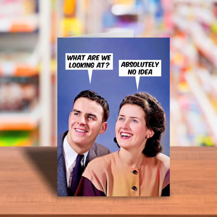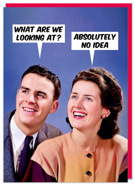 A greeting card with a 1960s picture of a young man and woman staring off into the distance. The man asks What are we looking at? to which the woman replies Absolutely no idea.