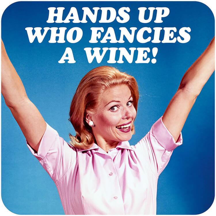 A coaster with a 1960s picture of a smiling blonde woman holding her hands up against a blue background. Above her rounded text reads Hands up who fancies a Birthday wine.