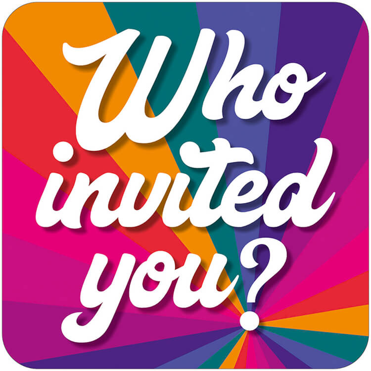 A rainbow patterned coaster with big curvy white text that reads Who invited you?