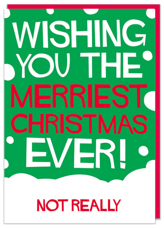 A text based Christmas card with a green background and snow. The card reads Wishing you the merriest Christmas ever. Not really.