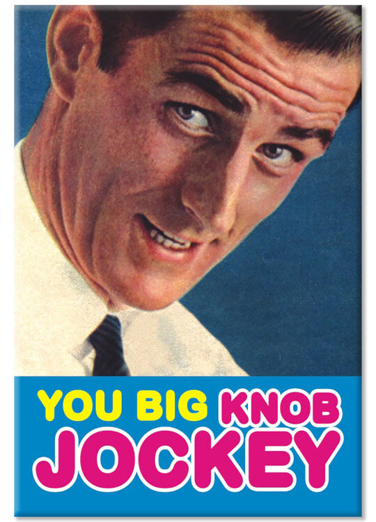A fridge magnet featuring a 1950’s style colourised photograph of a chap in a suit leaning closely in, speaking and looking at camera, with the caption ‘You big knob jockey’ written in bold rounded font, using capital yellow letters, and pink capital letters outlined in white on a light blue banner.