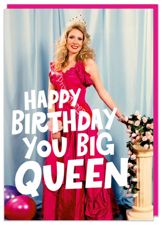 A birthday card with a retro photo of a smiling teenager dressed a bright red prom dress. Funky white capitalised font over the image reads Happy birthday you big queen.