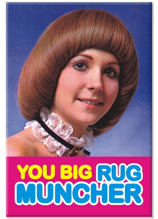 A fridge magnet for the rug muncher in your life – ideal as a funny gift for others or a fun item on your own fridge. This funny fridge magnet features a 1980’s style photograph of a young lady with a permed bowl haircut, wearing a lace choker and the words ‘You big rug muncher’, written in capital letters in bold yellow and blue outlined in white, with the words set on a bright pink background banner.