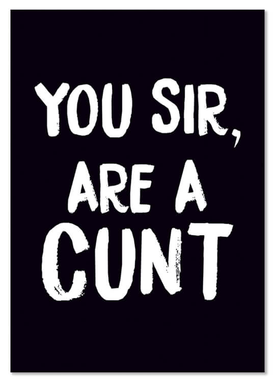 Looking for the most formal way to tell them how much of a cunt they are? After all, one has to remember one's diction. Here's a jet black postcard, with 'painted letter' style writing in white saying 'You sir, are a cunt' in capital letters.