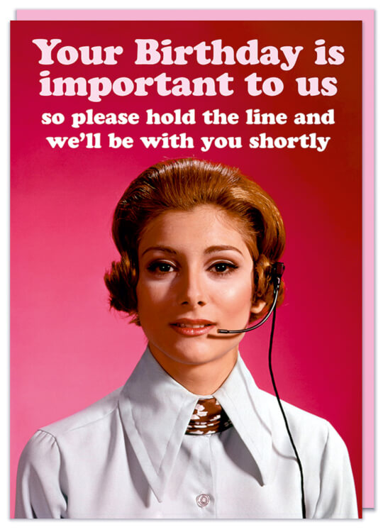 A birthday card with a 1960s photo of a female call centre operator looking direct to the camera. White and pink text above reads Your birthday is important to us so please hold the line and we'll be with your shortly.