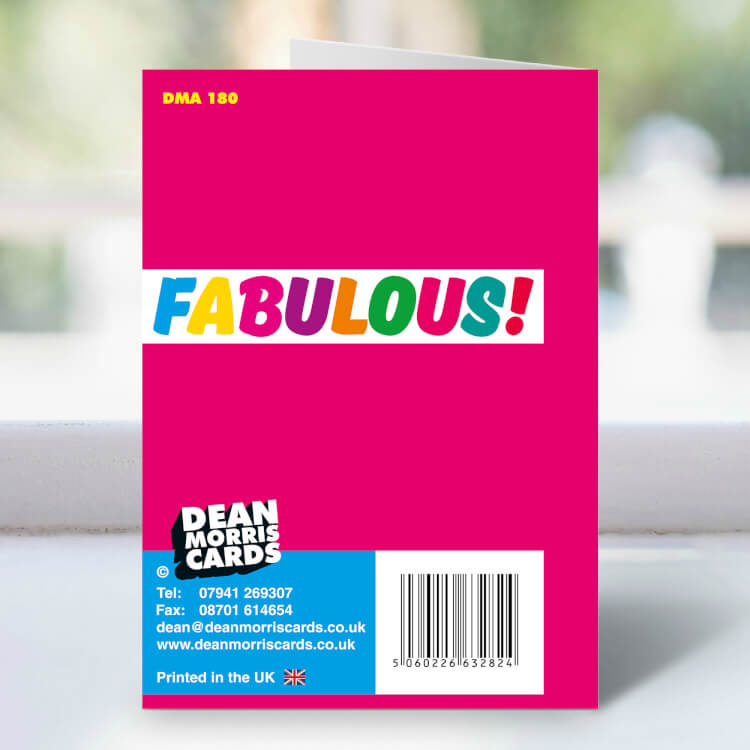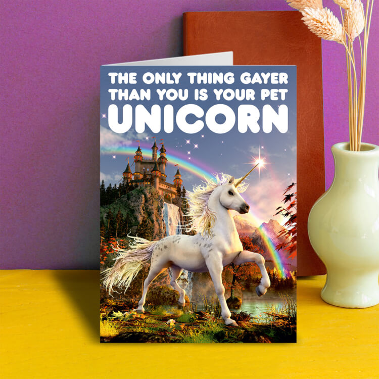 A greeting card with a photo of a unicorn in front of a magical castle. Text above reads The only thing gayer than you is your pet unicorn.
