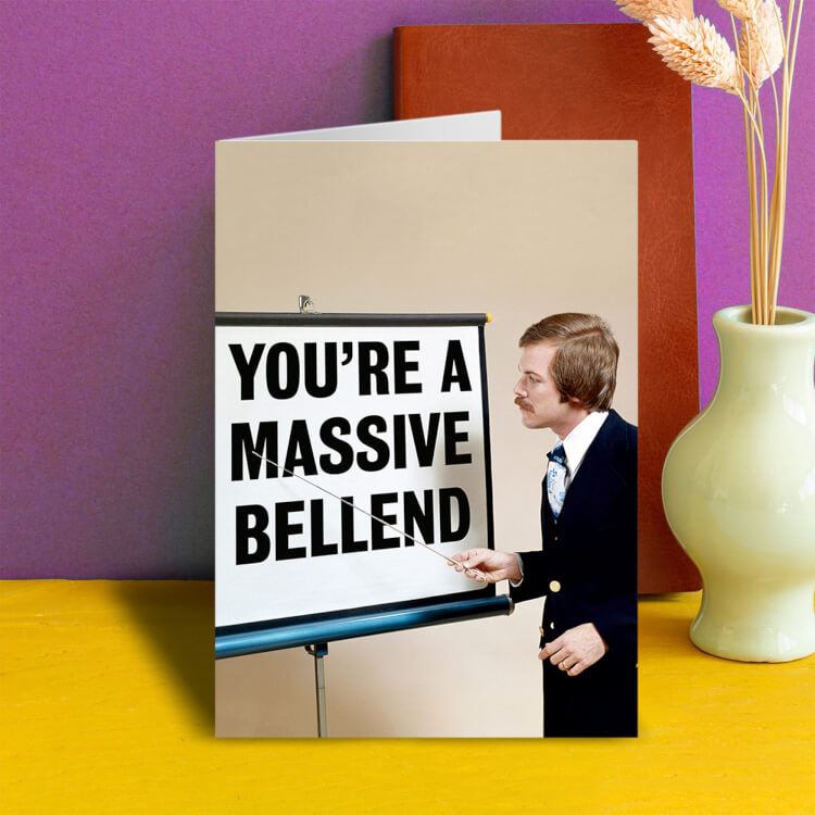 A greeting card with a retro picture of a businessman pointing at a whiteboard. On the board reads You're a massive bellend.