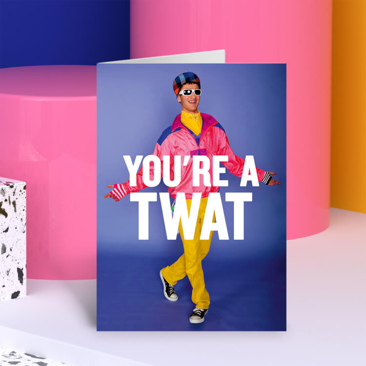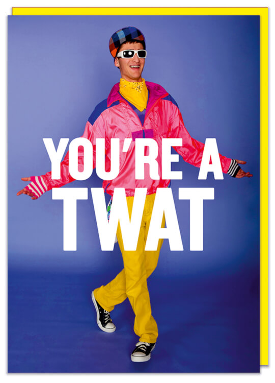 A greeting card with a funny picture of a man in a 1990s shell suit walking against a blue background. White bold text in front of him reads You're a twat.