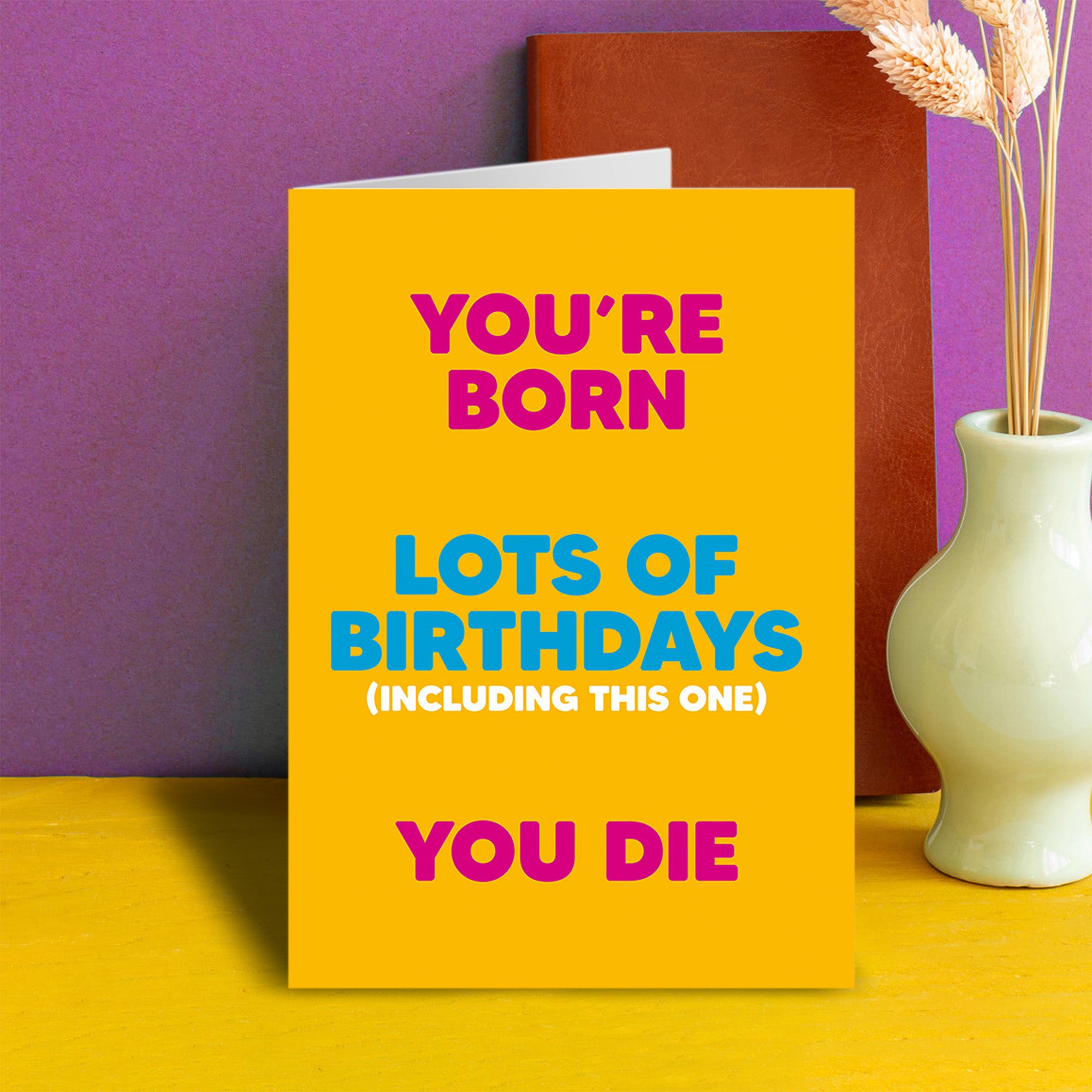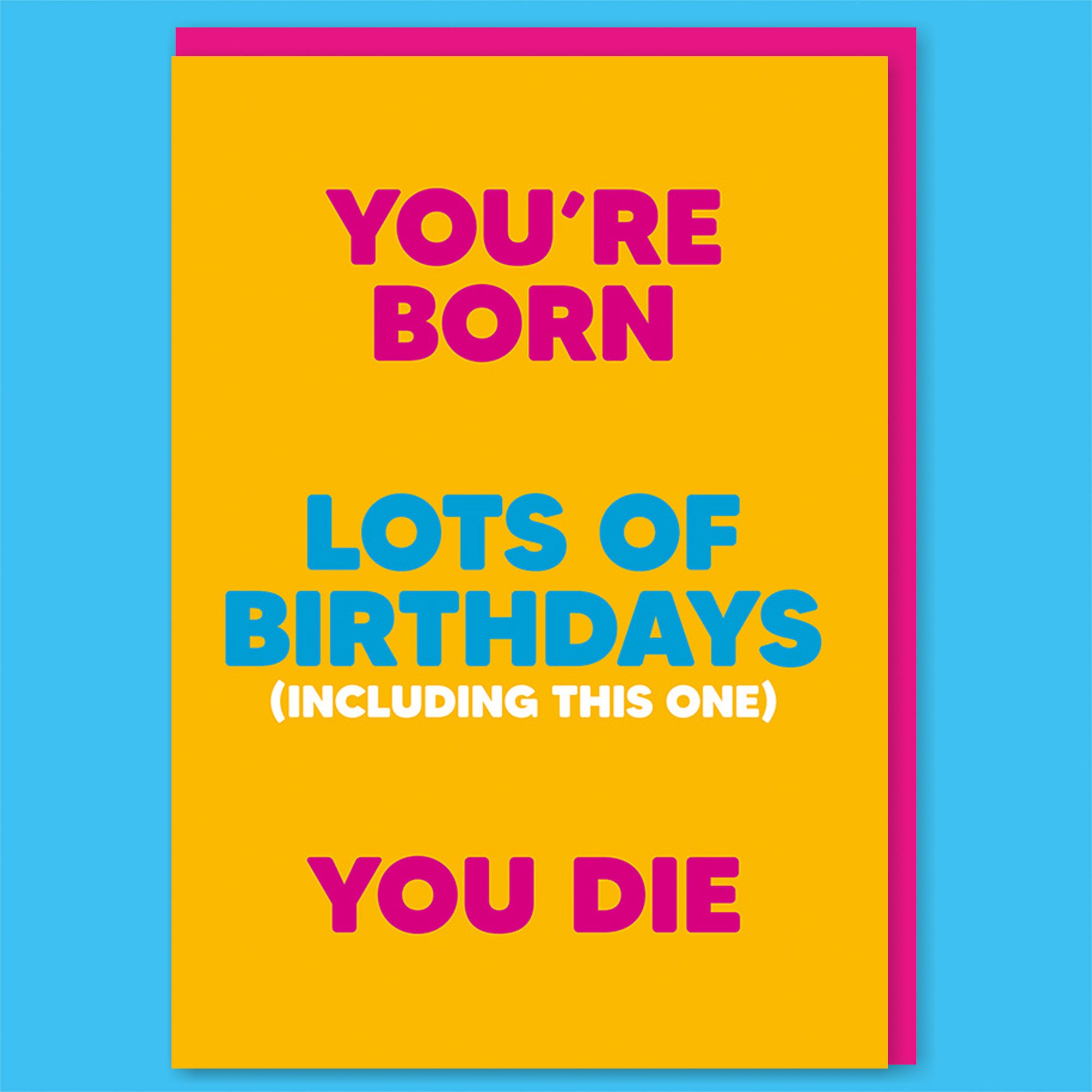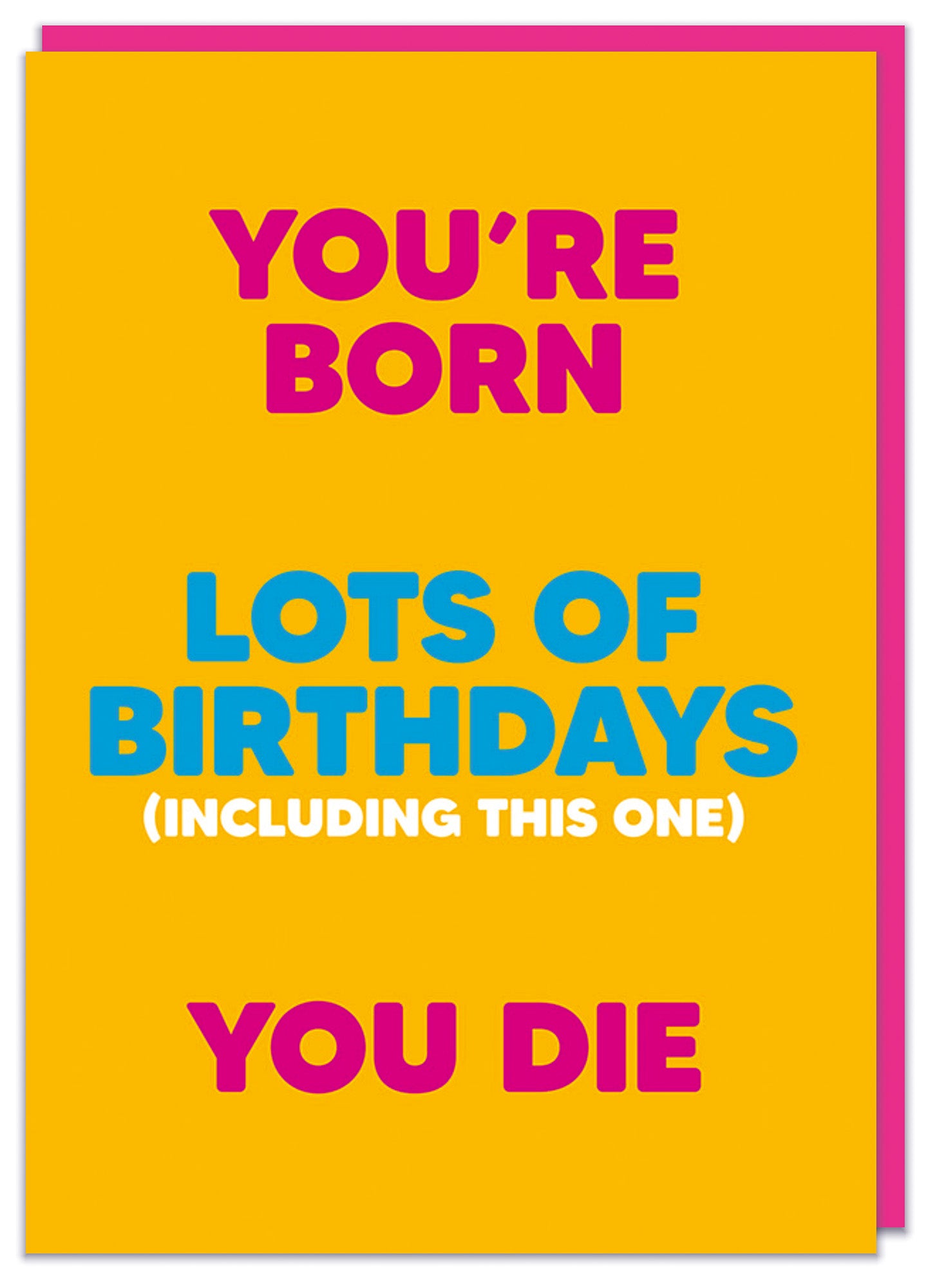 A birthday card featuring bold typographic text arranged vertically in three sections. The text reads “You’re born” at the top, “Lots of birthdays (including this one)” in the centre, and “You die” at the bottom. The background is a bright yellow colour, with the top and bottom text in pink and the middle text in blue, with the bracketed line in smaller white text.