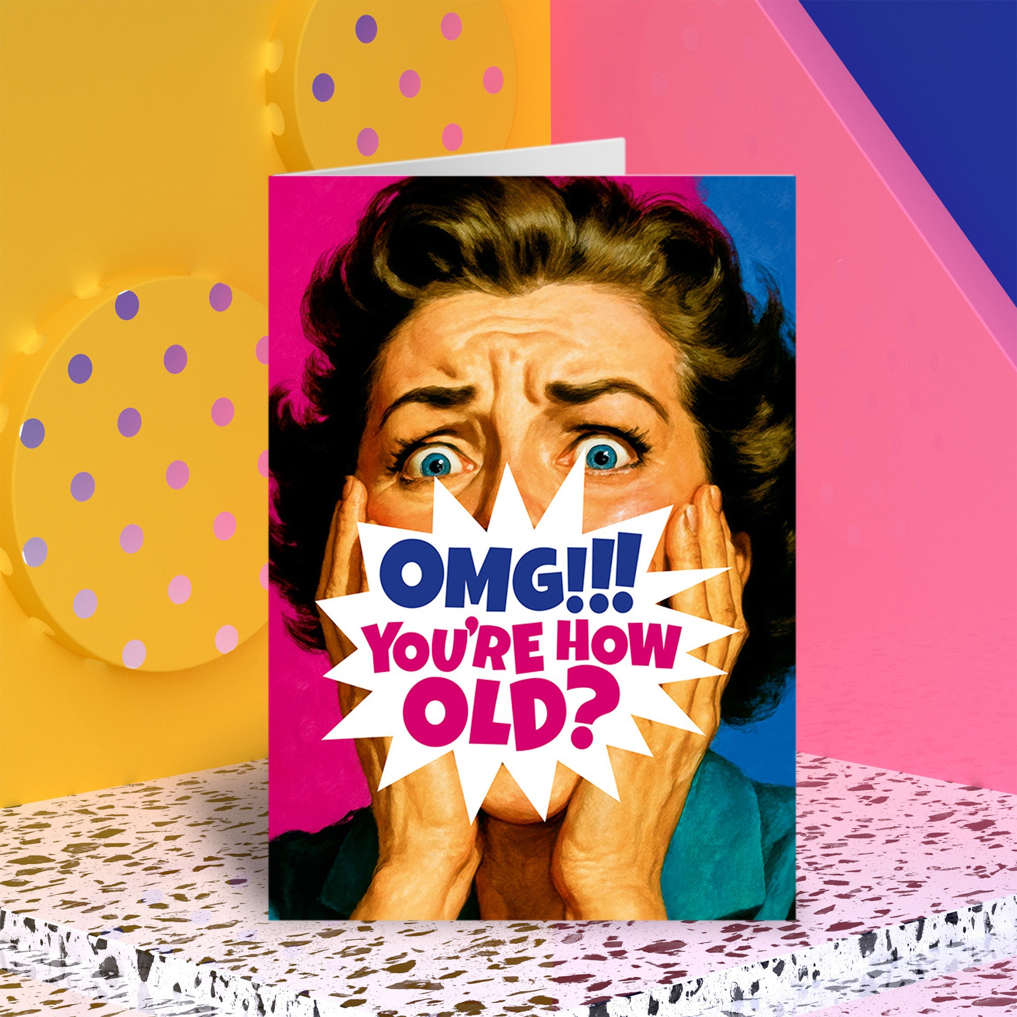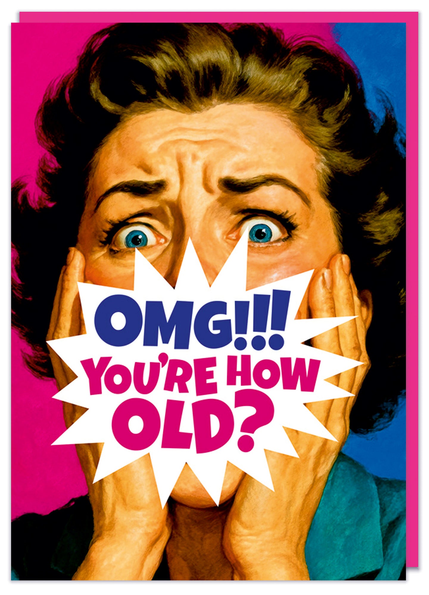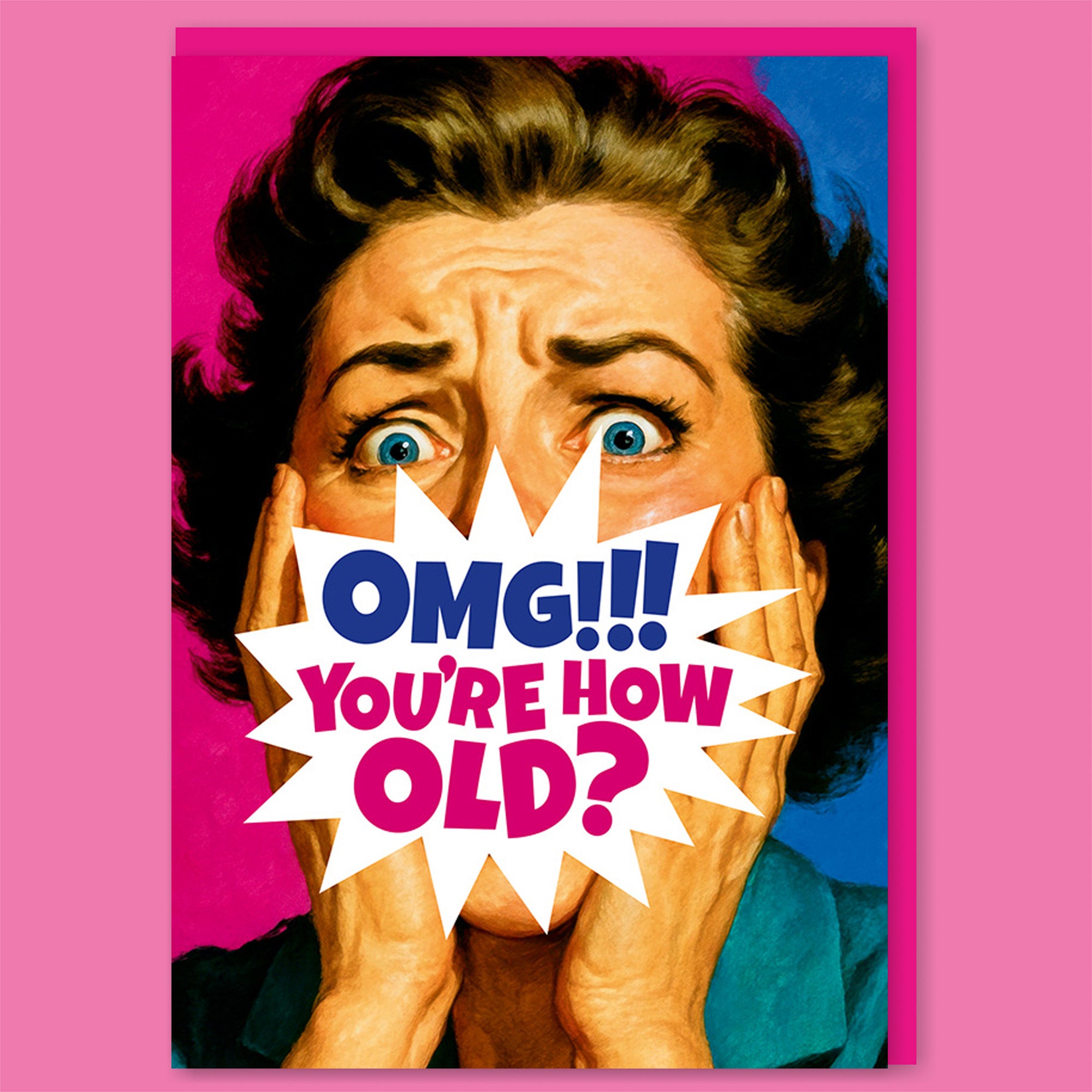 A funny birthday card featuring a vintage-style illustration of a woman with wide blue eyes and a shocked expression, holding her face with both hands. Her mouth is covered by a white starburst graphic. The background is split into bright pink and blue colors. Bold text inside the starburst reads “OMG!!! You’re how old?”