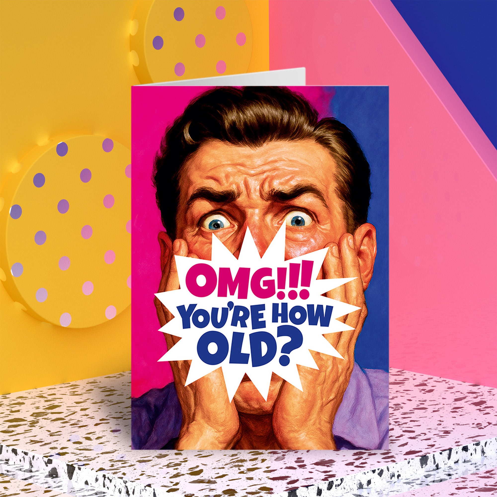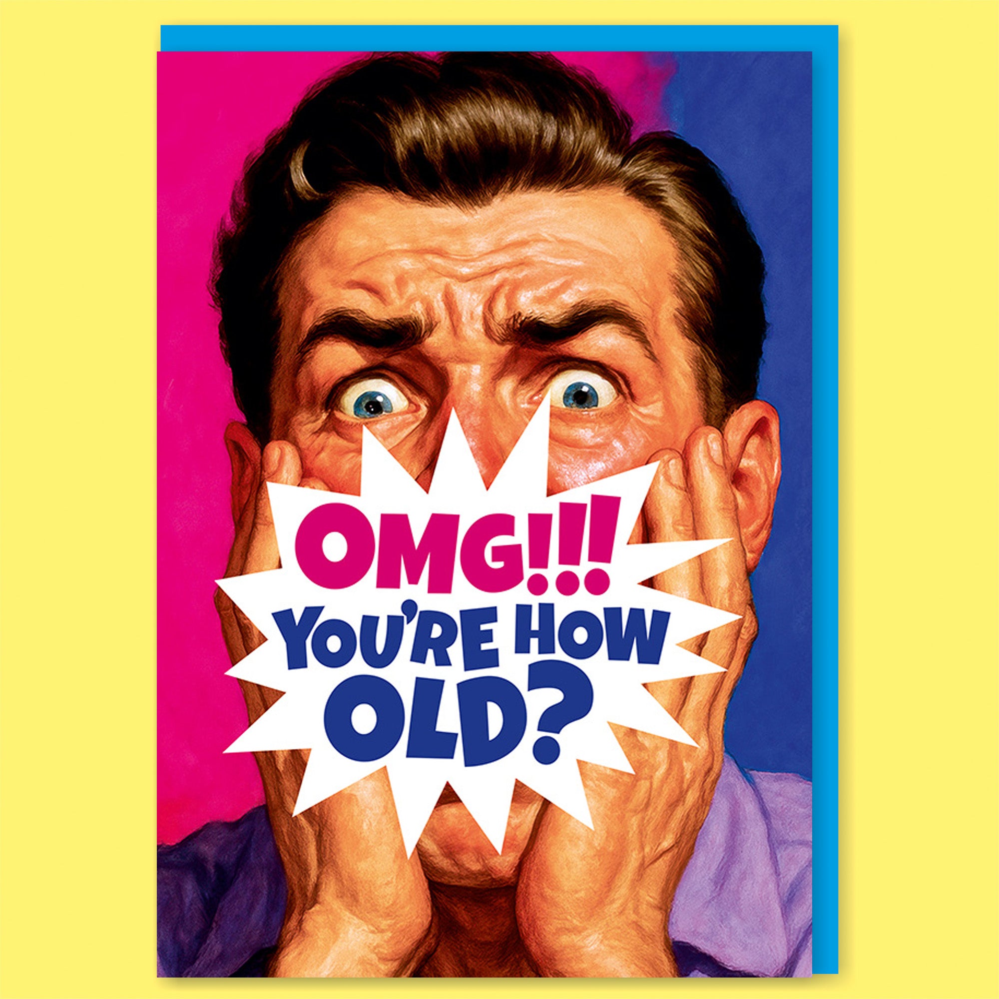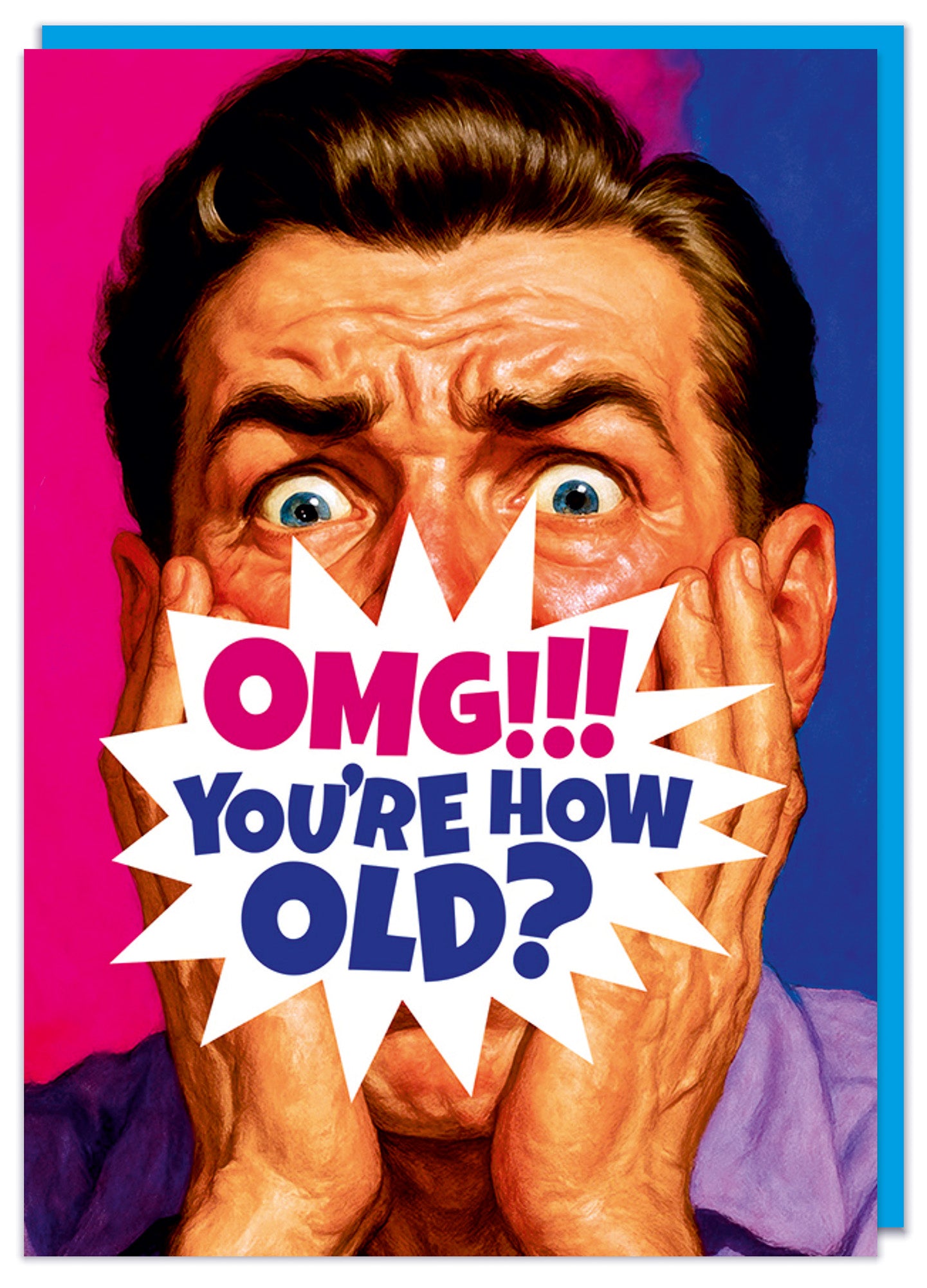 A funny birthday card featuring a vintage-style illustration of a man with wide blue eyes and a shocked expression, holding his face with both hands. A white starburst graphic covers his mouth. The background is split into bright pink and blue colors. Bold text inside the starburst reads “OMG!!! You’re how old?”