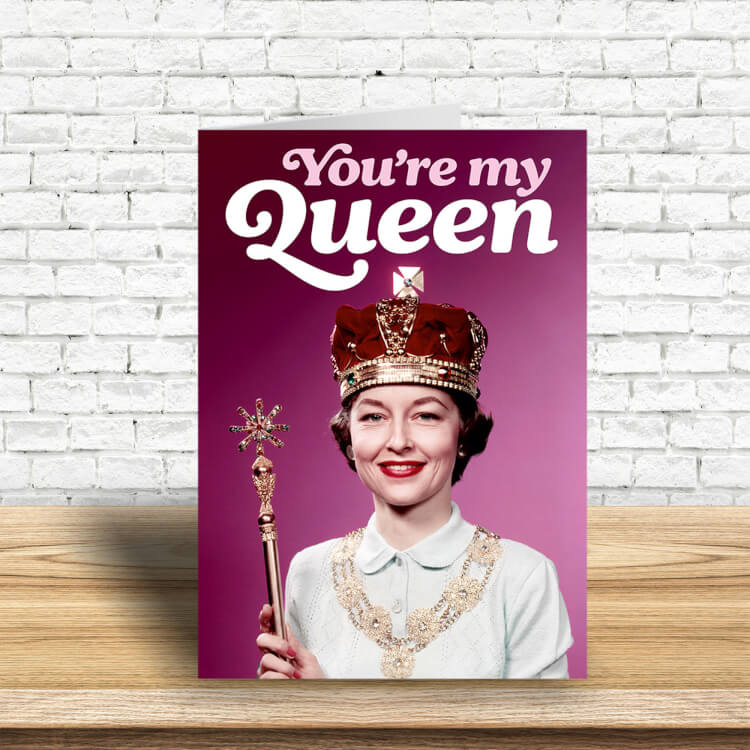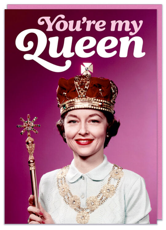 A greeting card with a retro picture of a smiling woman with dark hair wearing a crown and holding a sceptre. Pink and white curved text above her reads You're my Queen.