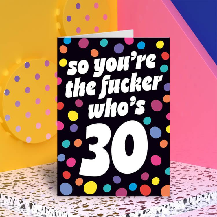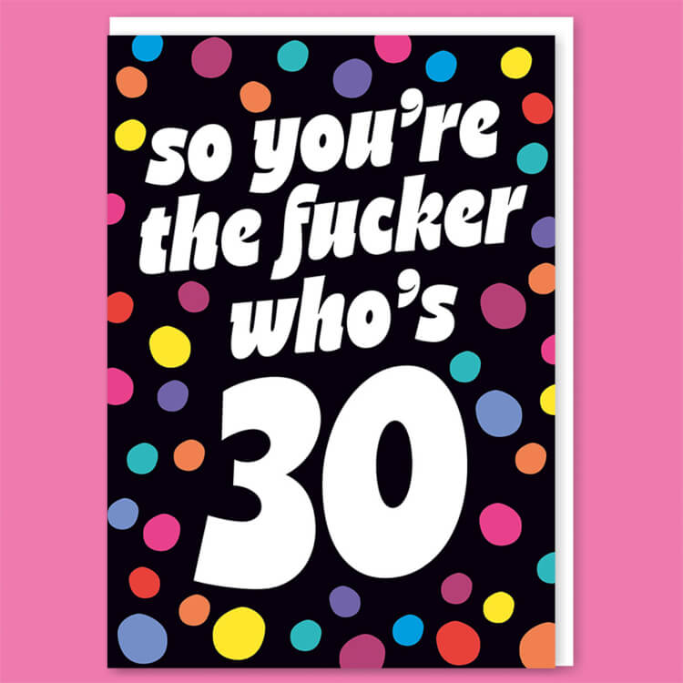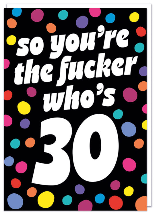 A funny greeting card featuring bold typographic text only. The background is black and scattered with brightly colored dots resembling confetti. Large white text reads “So you’re the fucker who’s” above an oversized white number “30” centered near the bottom.