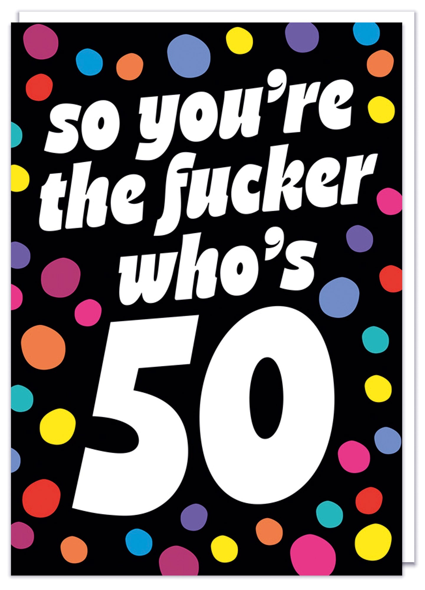 A funny greeting card featuring bold typographic text only. The background is black and scattered with brightly colored dots resembling confetti. Large white text reads “So you’re the fucker who’s” above an oversized white number “50” centered near the bottom.