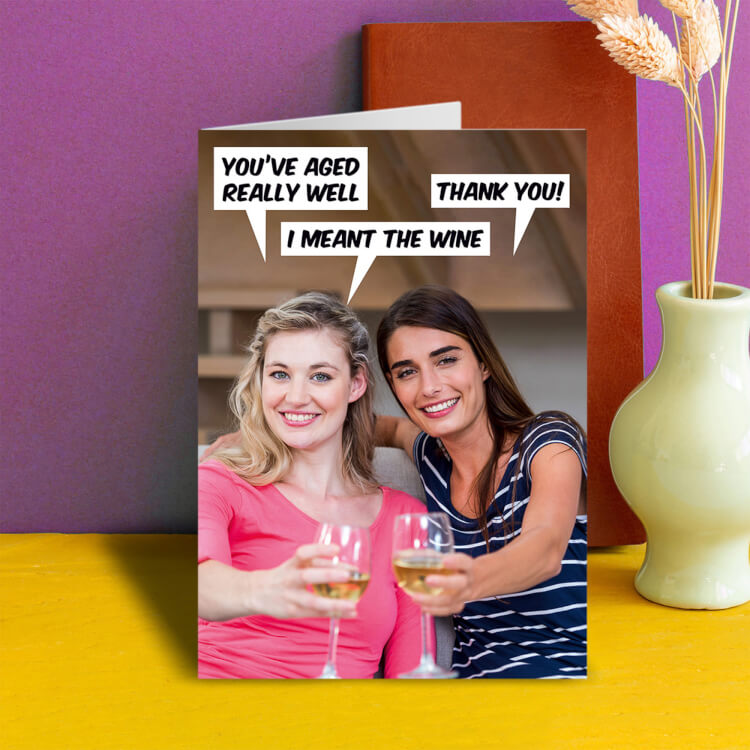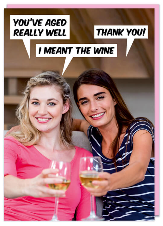 A birthday card with a modern photo of two young women drinking wine and holding to the camera. One, in a pink dress says You've aged really well. The other replies Thank you, to which she replies I meant the wine.